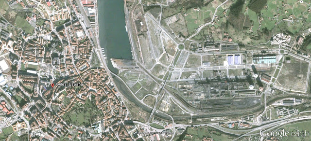 Y para acabar, una última innovación técnica. Como con el spypnic y google earth también podemos viajar en el tiempo, le doy a un botón y podemos ver ahí abajo el casco urbano de Avilés, los Altos Hornos de Ensidesa y el fondo de la ría sin la memez esa de los bultos blancos gigantescos de tan inspirada creación: